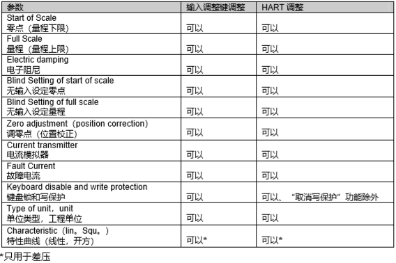 西門子壓力變送器參數(shù)的調(diào)整可以在現(xiàn)場(chǎng)通過(guò)儀表自身配備的三個(gè)輸入調(diào)整鍵實(shí)現(xiàn),也可以通過(guò)HART 協(xié)議外部實(shí)現(xiàn)。以下表中列出的為上述可實(shí)現(xiàn)的基本參數(shù)。其它用于特別用途的參數(shù)可以通過(guò) HART 協(xié)議調(diào)整。