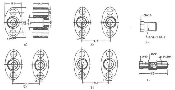 差壓變送器法蘭為1/4" -18NPT錐管連接螺紋。引壓管線可以通過1/4" -18NPT錐管連接管頭直接安裝在差壓變送器法蘭上,正負兩根引壓管間距為54mm。這種安裝方式雖然簡單但不利于差壓變送器調(diào)整和拆卸;引壓管線也可以通過三通閥安裝在差壓變送器法蘭上(三通閥須自備或特別定購),引壓管線也可以通過橢圓法蘭安裝在差壓變送器法蘭上,橢圓法蘭為1/2”-14NPT錐管連接螺紋,通過擰下橢圓法蘭固定螺桿,使差玉變送器很方便地從工藝流程引壓管線上拆下來。可以通過橢圓法蘭改變引壓管徑,也可通過改變-一個或個橢圓法蘭尺寸, 圖B) C)D)為橢圓法蘭不同安裝角度尺寸。圖E) F)為EJA差壓變送器法蘭密封絲堵和放氣排污閥。注:橢圓法蘭、密封絲堵和放氣排污閥為選購件。